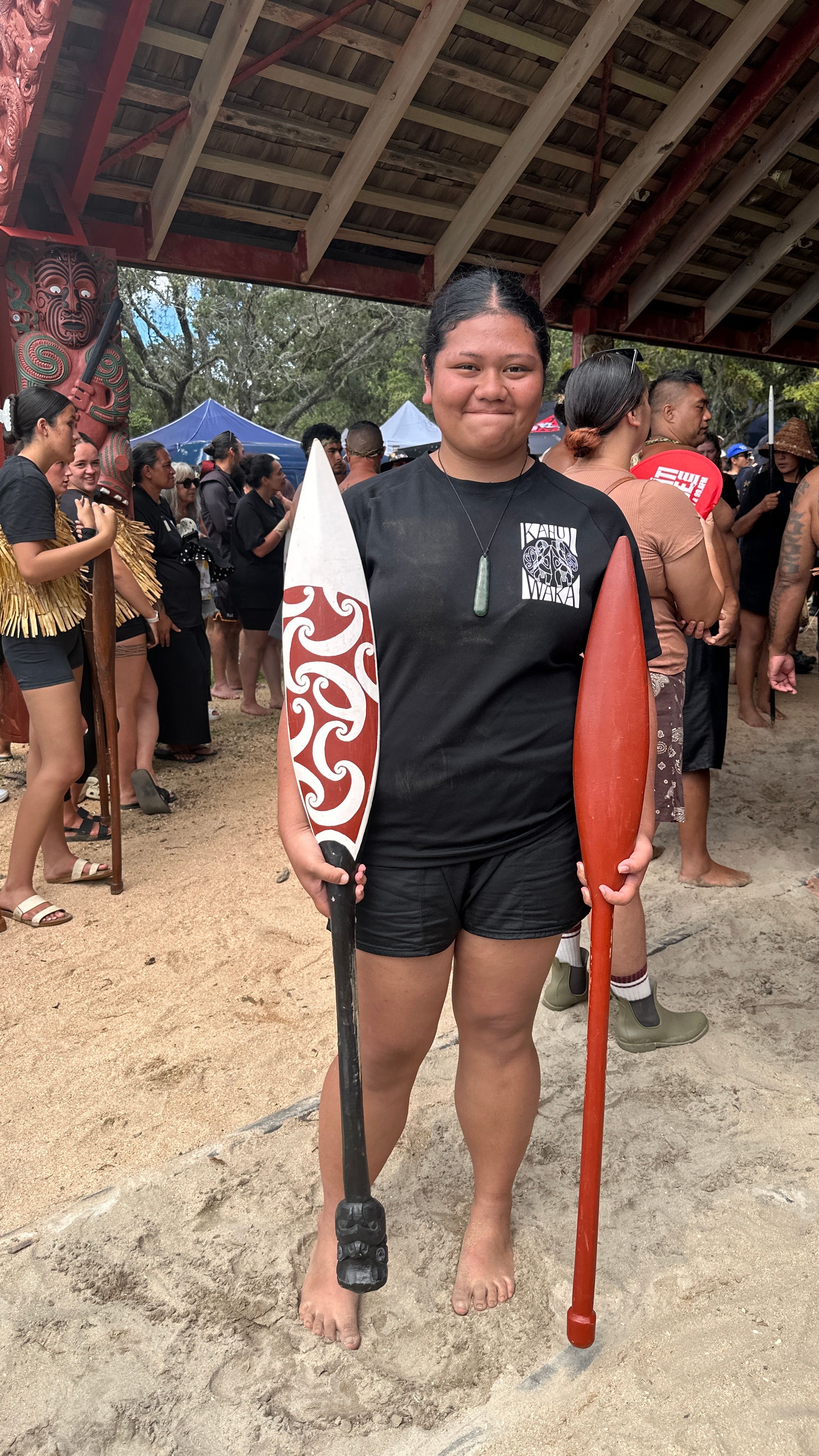 A young kaihoe (paddler) shows how paddles can differ in size and design. Photo/PMN News