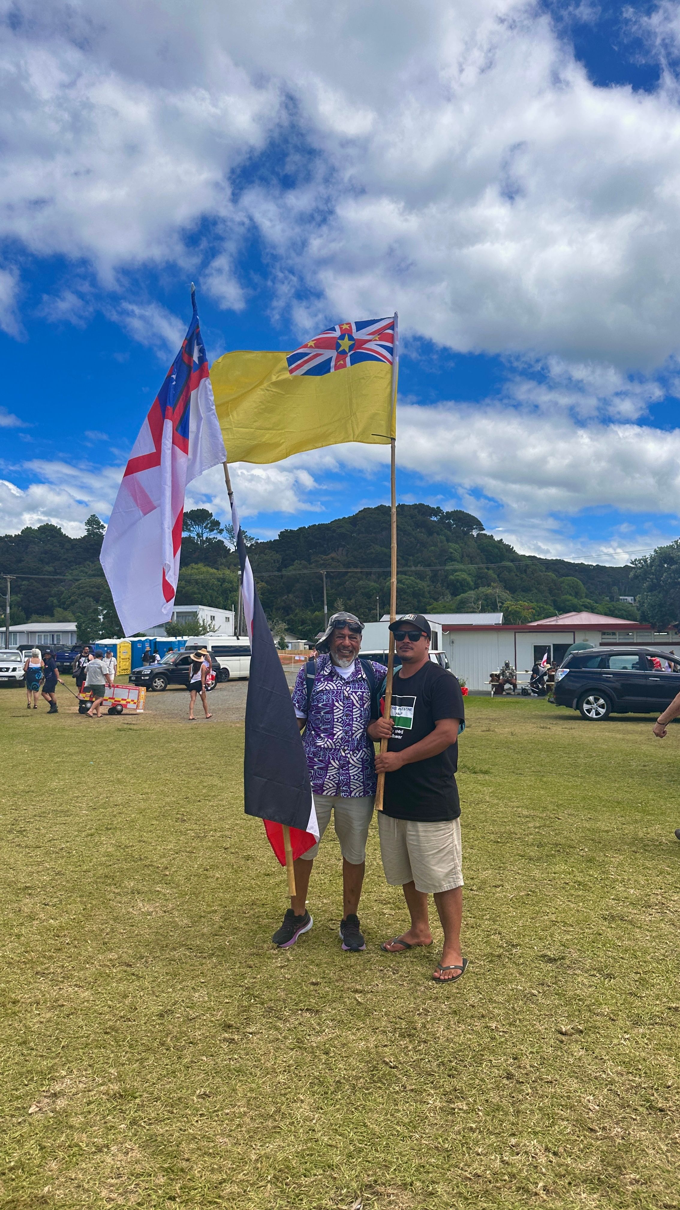 Toa with his son, are proud Niueans who have been waving the golden flag all week around the grounds. Photo/PMN News