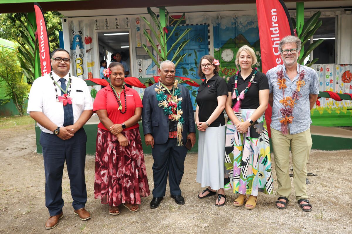 (L-R) Taulia Tafiti (Area Humanitarian Manager, Welfare and Self-Reliance Manager – Pacific Area, The Church of Jesus Christ of Latter-day Saints), Save the Children Vanuatu Country Director Relvie Matariki, Prime Minister Honourable Jotham Napat, Save the Children NZ CEO Heather Campbell, former Vanuatu Country Director Polly Banks and Huw Kingston. Photo/Save the Children New Zealand