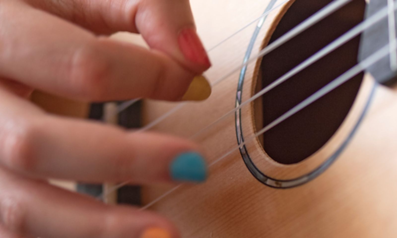 Close‑up of hands strumming a ukulele’s four strings (G, C, E, A). Photo/allegromusicschools.com