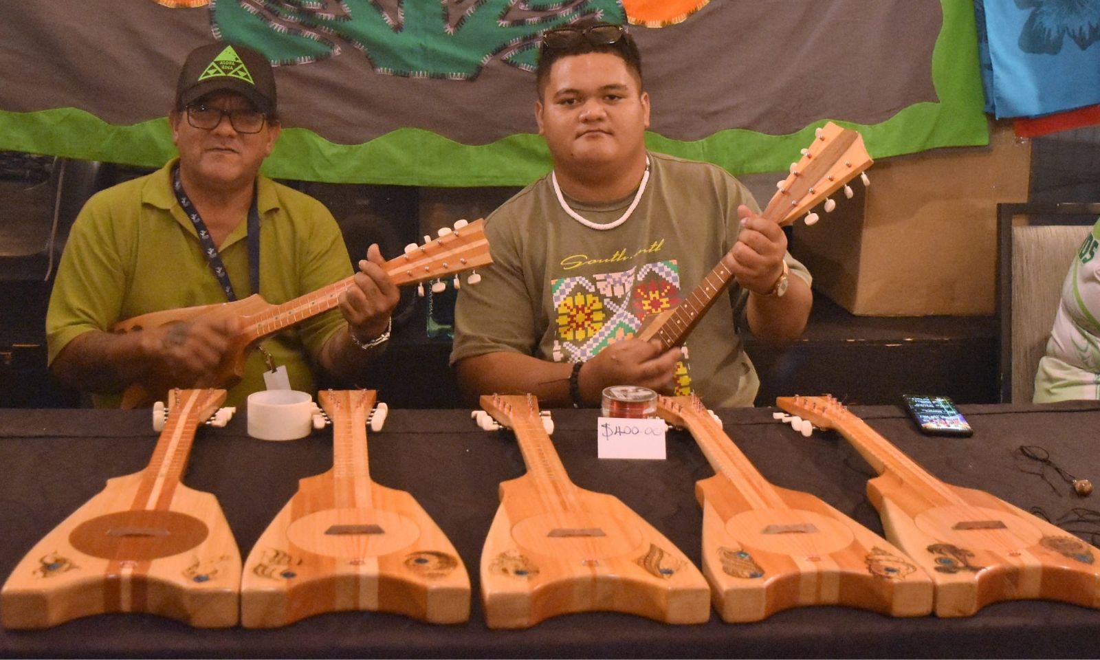 Renowned ukulele maker Ricky Adamu, left, in the FestPAC Village at the Hawai’i Convention Center in Honolulu. Photo/Cook Islands News/Melina Etches