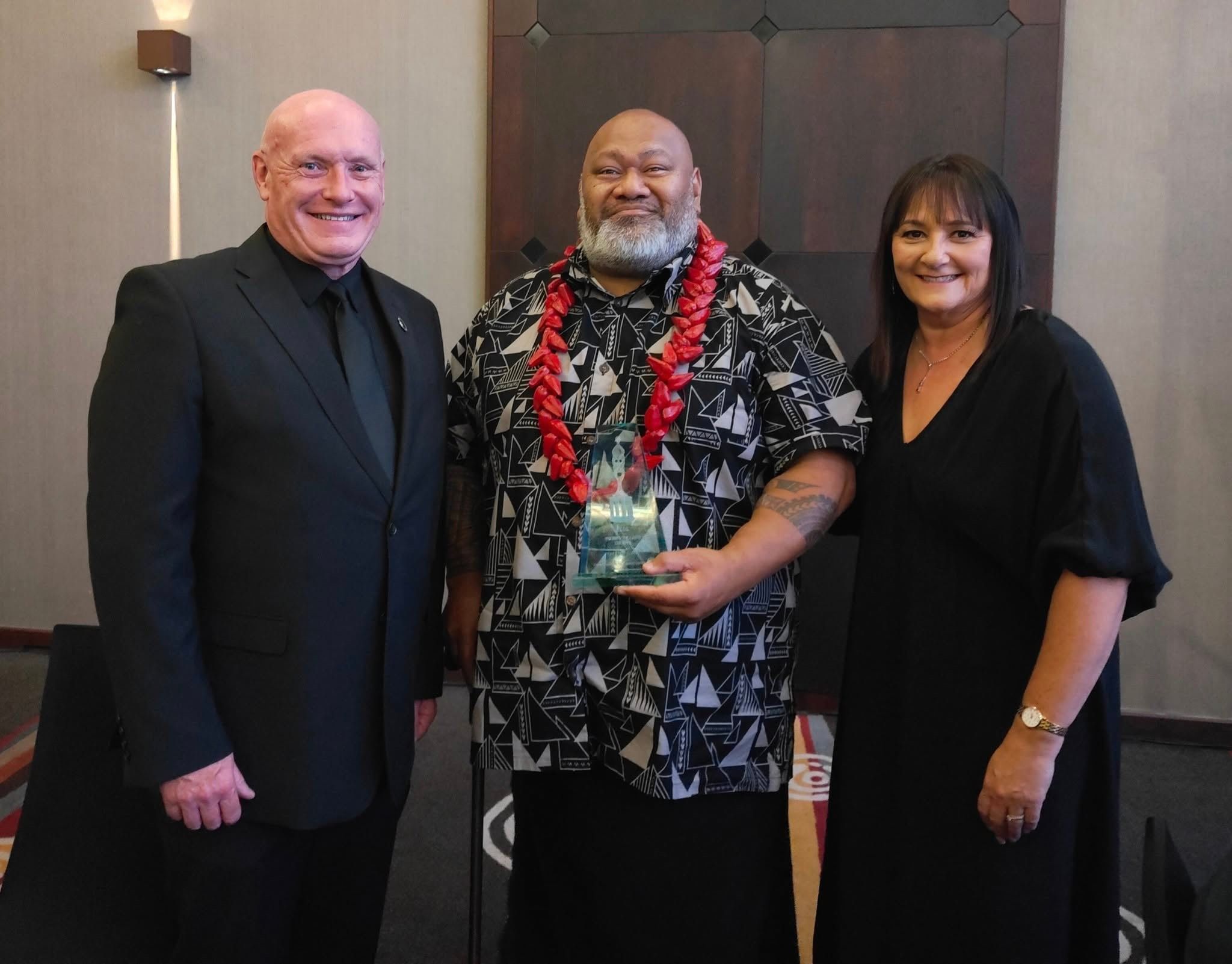 Tofiga Fepulea’i has been recognised as Aotearoa New Zealand’s top comedian. Pictured at the 2025 Benny Awards with "Trumpetguy" John McGough (right) and an awards official. Photo/Supplied