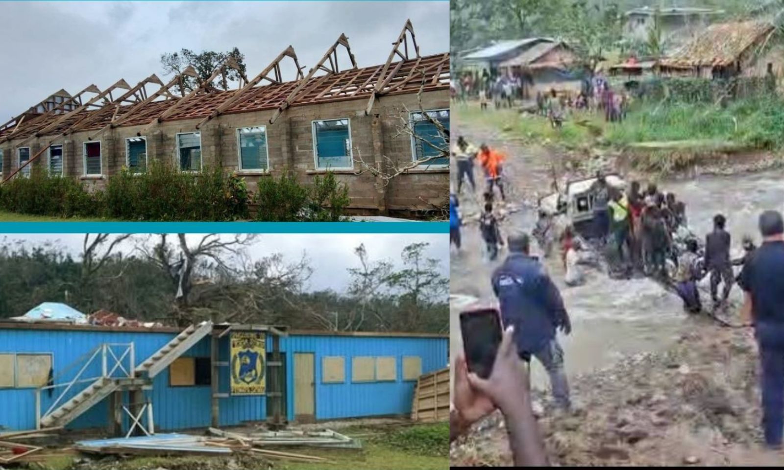 Pictured left: Thirty-two schools in three provinces have been affected in the Solomon Islands with Choiseul and Western Province among the worst hit. At right is Central Bougainville Disaster Response Team evacuates the injured from Kongara landslide in Bougainville, PNG. Photo/Facebook/Tavuli News/NBC Bougainville - Maus Blong Sankamap/Ben Kinah