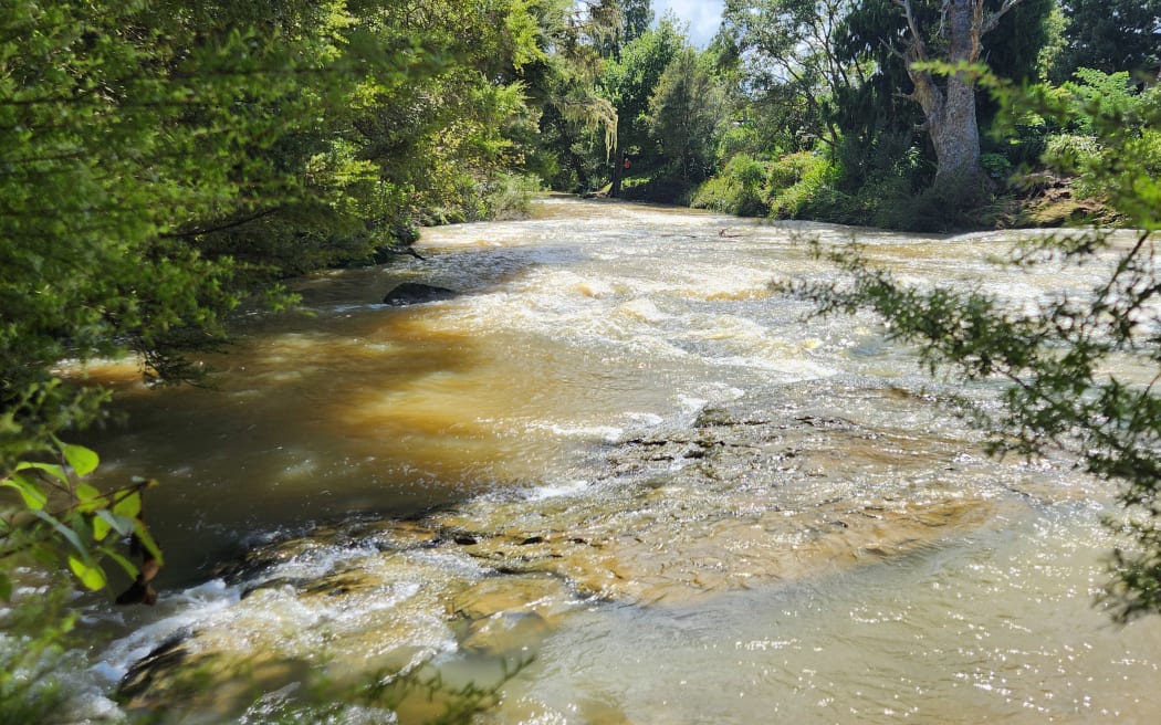 The Mahurangi River at Falls Road, Warkworth, where floodwaters swept away a 47-year-old man earlier this week. Police and volunteers searched the area in challenging conditions. Photo/RNZ/Finn Blackwell