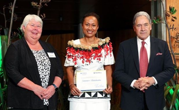 Dr Sainimere Boladuadua (centre) at the Fulbright awards ceremony with the United States Consul General Sarah Nelson, and Minister of Foreign Affairs and Honorary Chair of Fulbright NZ, Rt Hon Winston Peters. Photo/Ōtago University