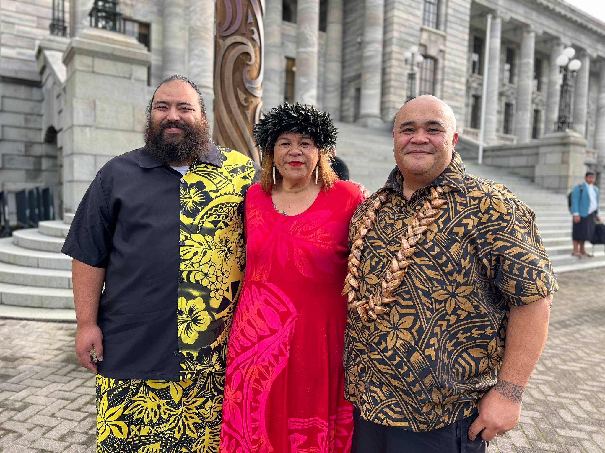 PSA has 6000 Pacific members. PSA's Pasefika Network presentatives Ulualofaiga Fesuia’i Mareko, left, and Patrick Feaunati, right, with Stella Teariki outside the Beehive. Photo/PSA/Facebook