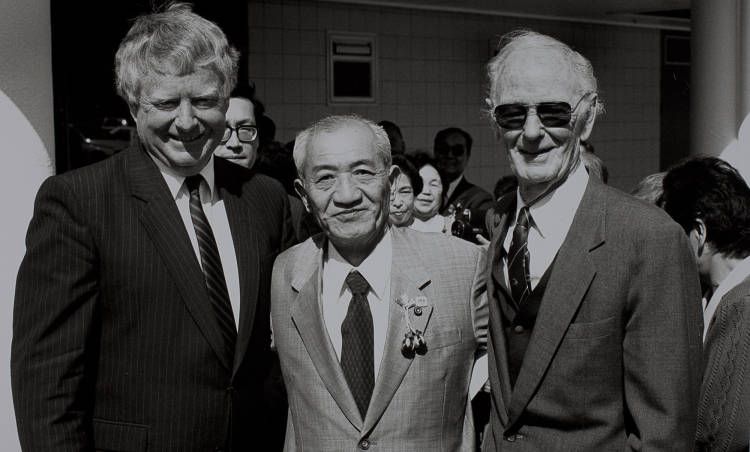 Former Utsunomiya City Assembly chairman Akira Suzuki (centre) with Manukau mayor Barry Curtis (left) and former mayor Sir Lloyd Elsmore at a reception in Papatoetoe, marking the renewal of Manukau and Utsunomiya’s sister city relationship first established in 1982. Photo/Auckland Libraries
