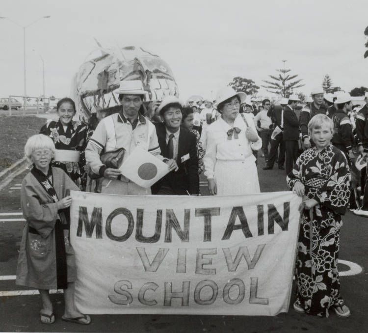 Utsunomiya delegates with students from Mountain View Primary School in Māngere, 1985. Photo/Auckland Libraries