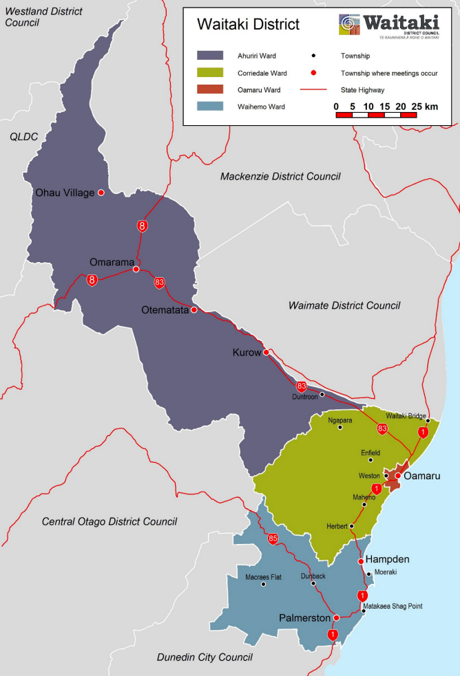 The Waitaki District is divided into four wards: Ōamaru, Corriedale, Ahuriri and Waihemo, with Ōamaru Ward serving as the district’s main urban and governance hub. Photo/Waitaki District Council