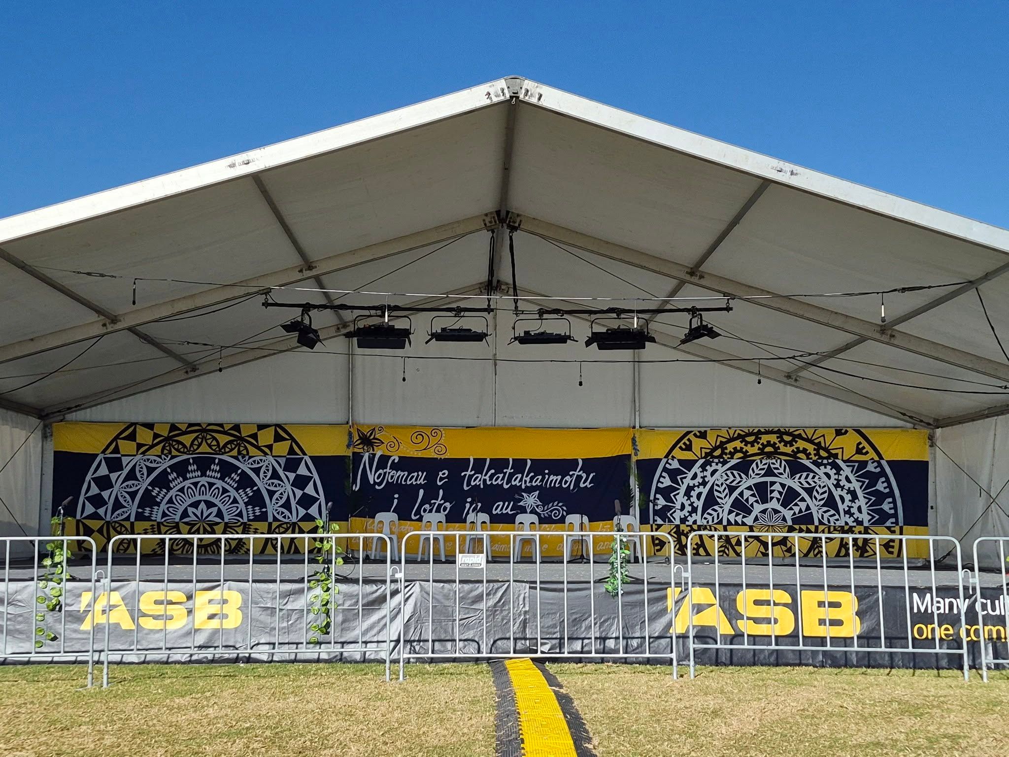 Niue Stage backdrop at ASB Polyfest 2026, designed by Elam School of Fine Arts student Tiola Kamupala of Avatele and Alofi. Photo/PMN Niue Facebook