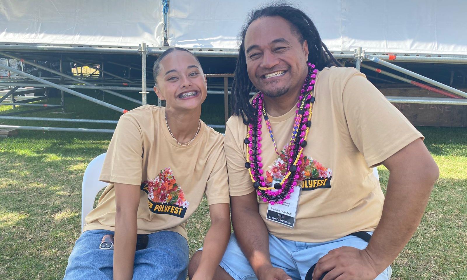 Niue stage coordinator Malakamu Lakatani with his daughter Aundreah Lakatani at ASB Polyfest 2026. Photo/PMN News/Taelegalolo'u Mary Afemata