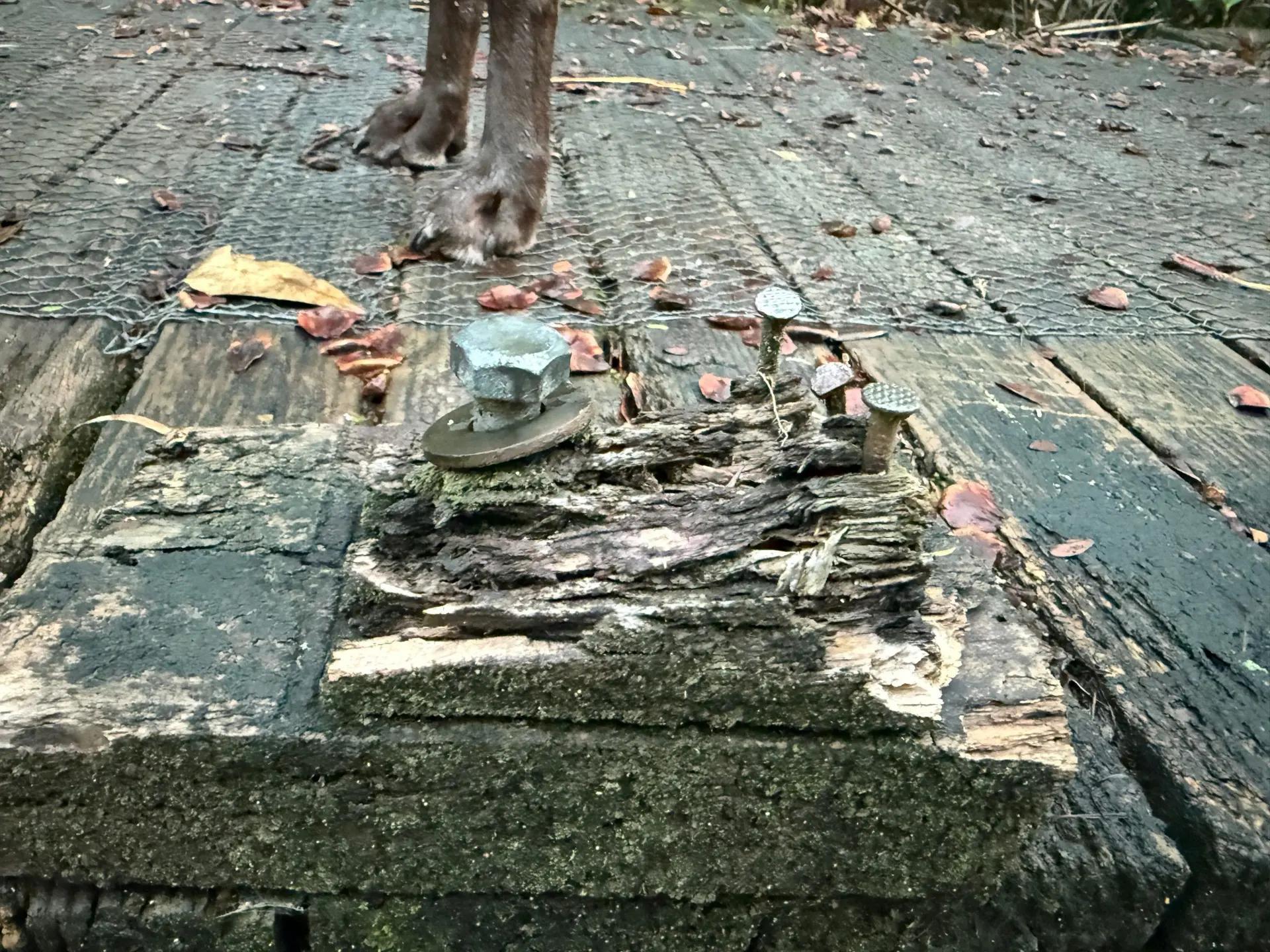 Protruding nails and screws posed a hazard to walkers on Titirangi Rd. Photo/Supplied via LDR