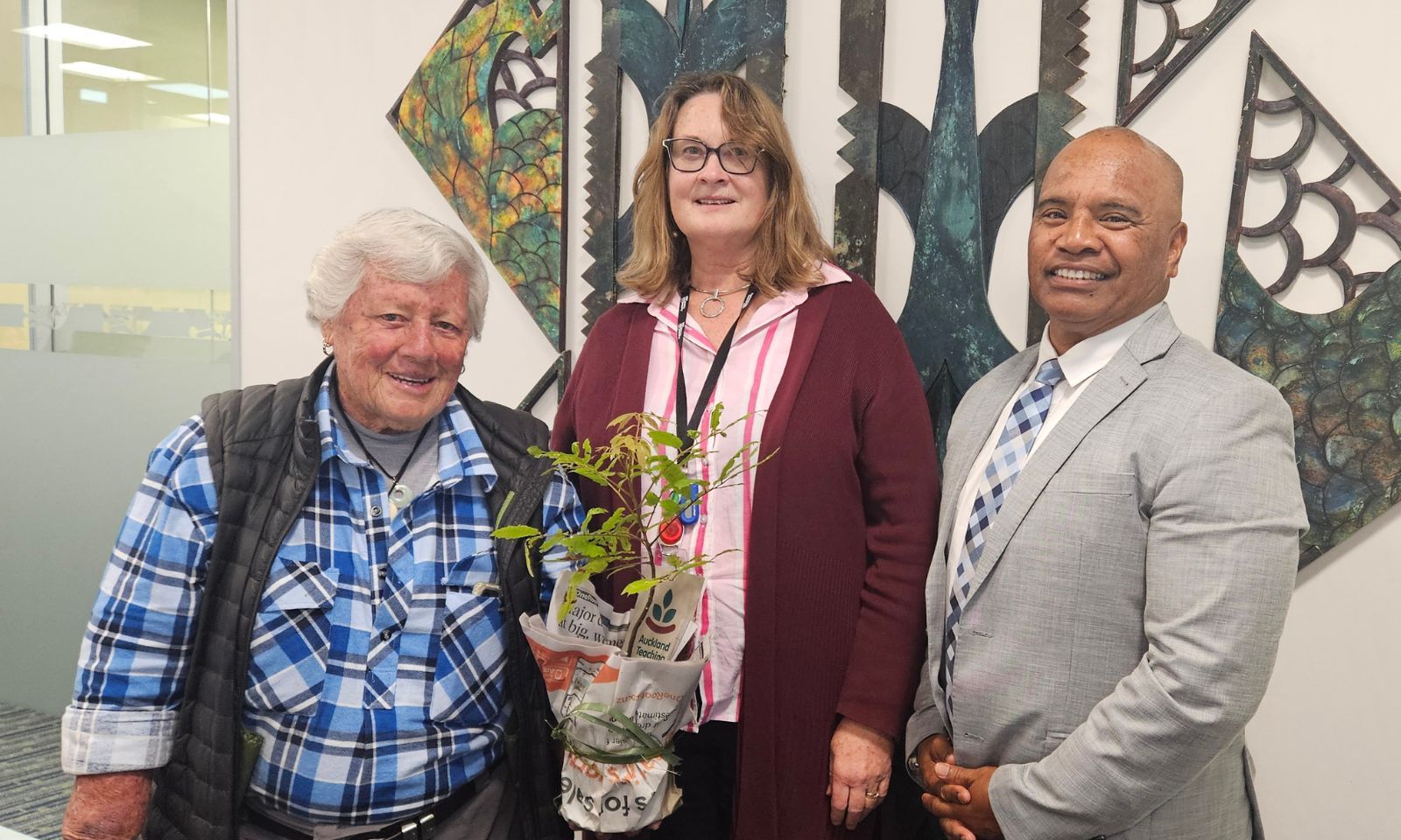 Yvonne Thomas (left) presents Māngere-Ōtāhuhu Local Board deputy chair Christine O’Brien and chair Kaea Walter Inoke-Togiamua with a tītoki plant she grew from seed, describing it as a symbol of resilience, mana and strength. Photo/PMN News/Taelegalolo'u Mary Afemata