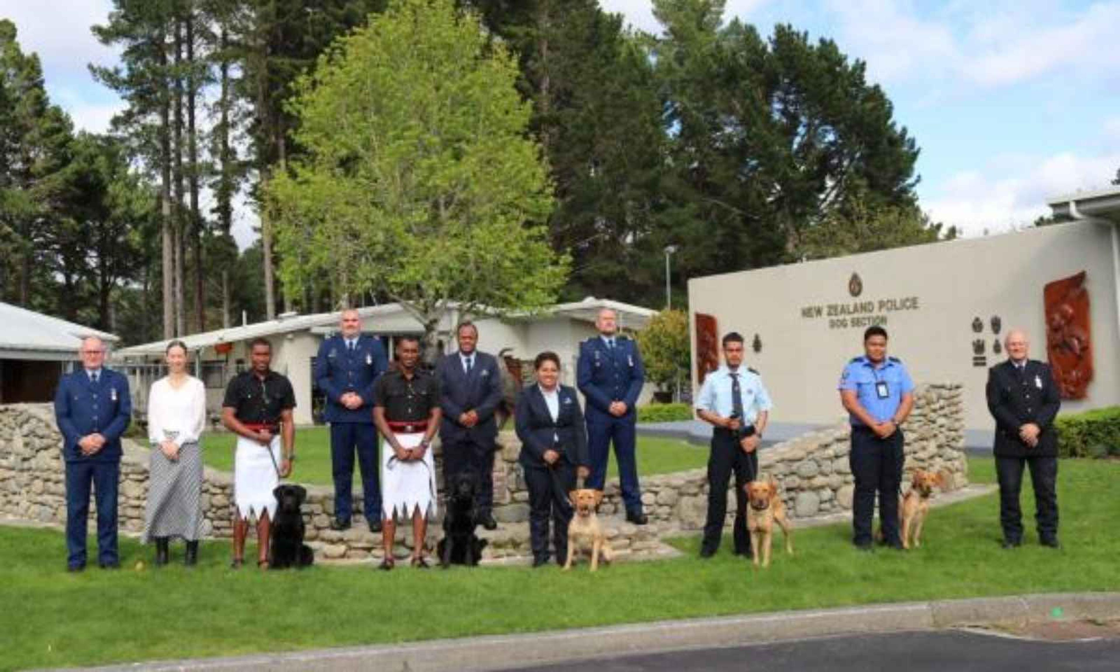(From left to right): Inspector Todd Southall (National Coordinator – Police Dogs), Erin Williams (Senior Project Officer, Overseas Programmes), Constable Ratu Esala Drole and Detector Dog Vena, Sergeant Mike Robinson (Trainer), Constable Sher Singh Junior and Detector Dog Vector, Principal Customs Officer Saimoni Tuiraki (Trainer), Senior Customs Officer Camari Rotukana and Detector Dog Ouzo, Sergeant Matt Fage (Trainer), Customs Officer Andrew Manu and Detector Dog Twiggy, Constable Miracle Malaefono Pose and Detector Dog Yoko, Chief Customs Officer Dave Huff (NZ Customs).