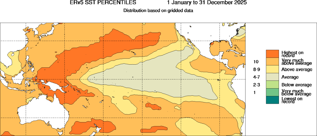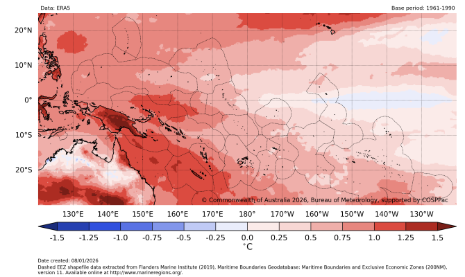 Average regional temperatures in 2025 were about 0.65°C above the 1961-1990 baseline, with long-term warming in the Pacific increasing by roughly 0.1°C per decade since 1940.
