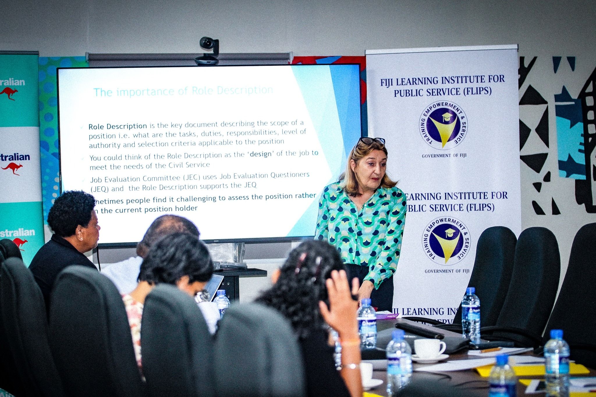 Job evaluator Branka Farquharson conducts an induction training for Fiji's Permanent Secretaries and members of the Job Evaluation Leadership Team (JELT) in Suva. Photo/Facebook/Ministry of Civil Service, Fiji