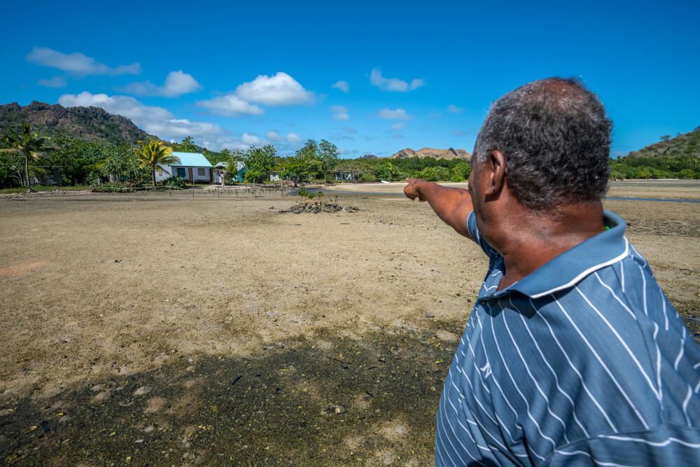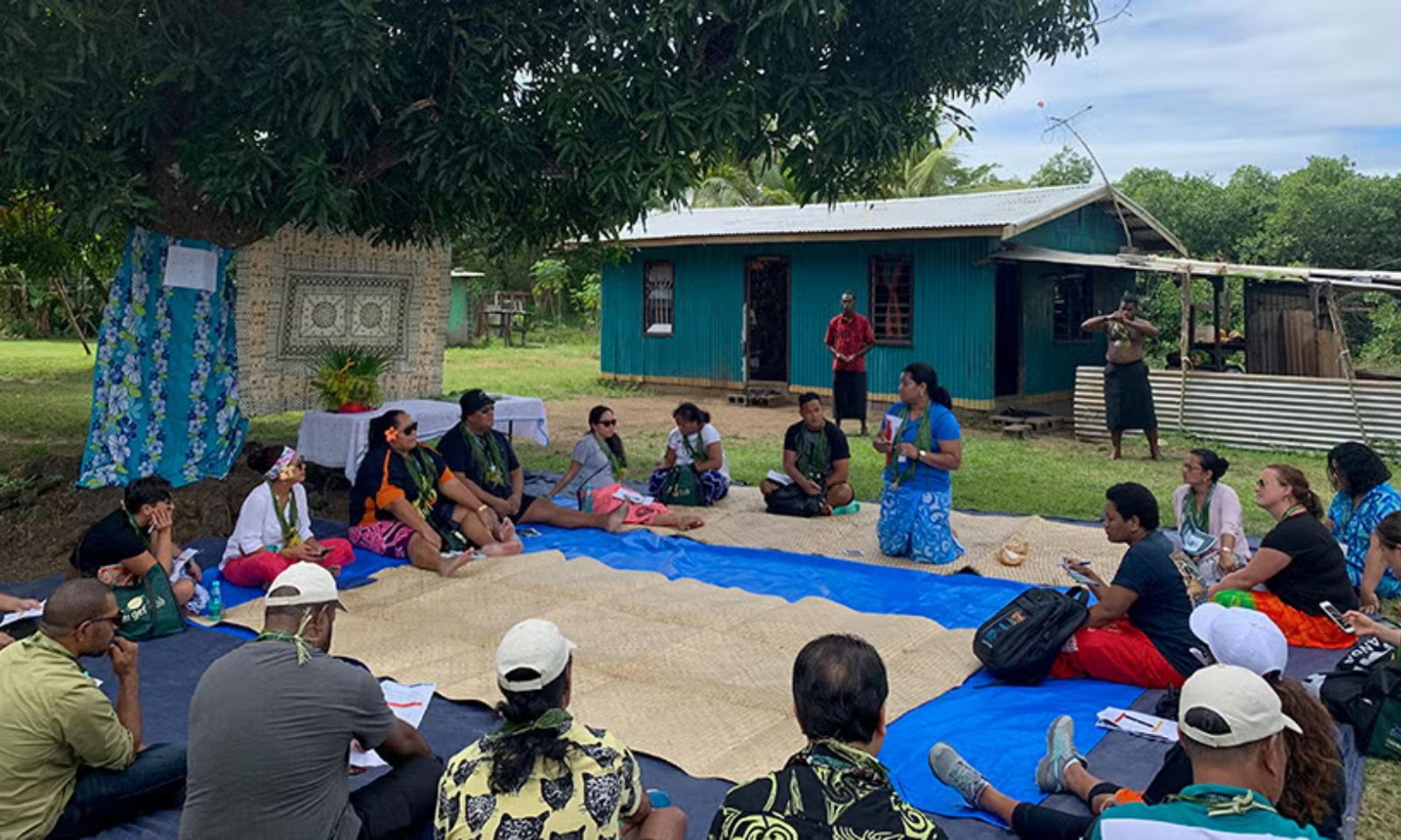 A community gathering in a Fijian coastal village, highlighting the connection between people, land, and traditional practices.