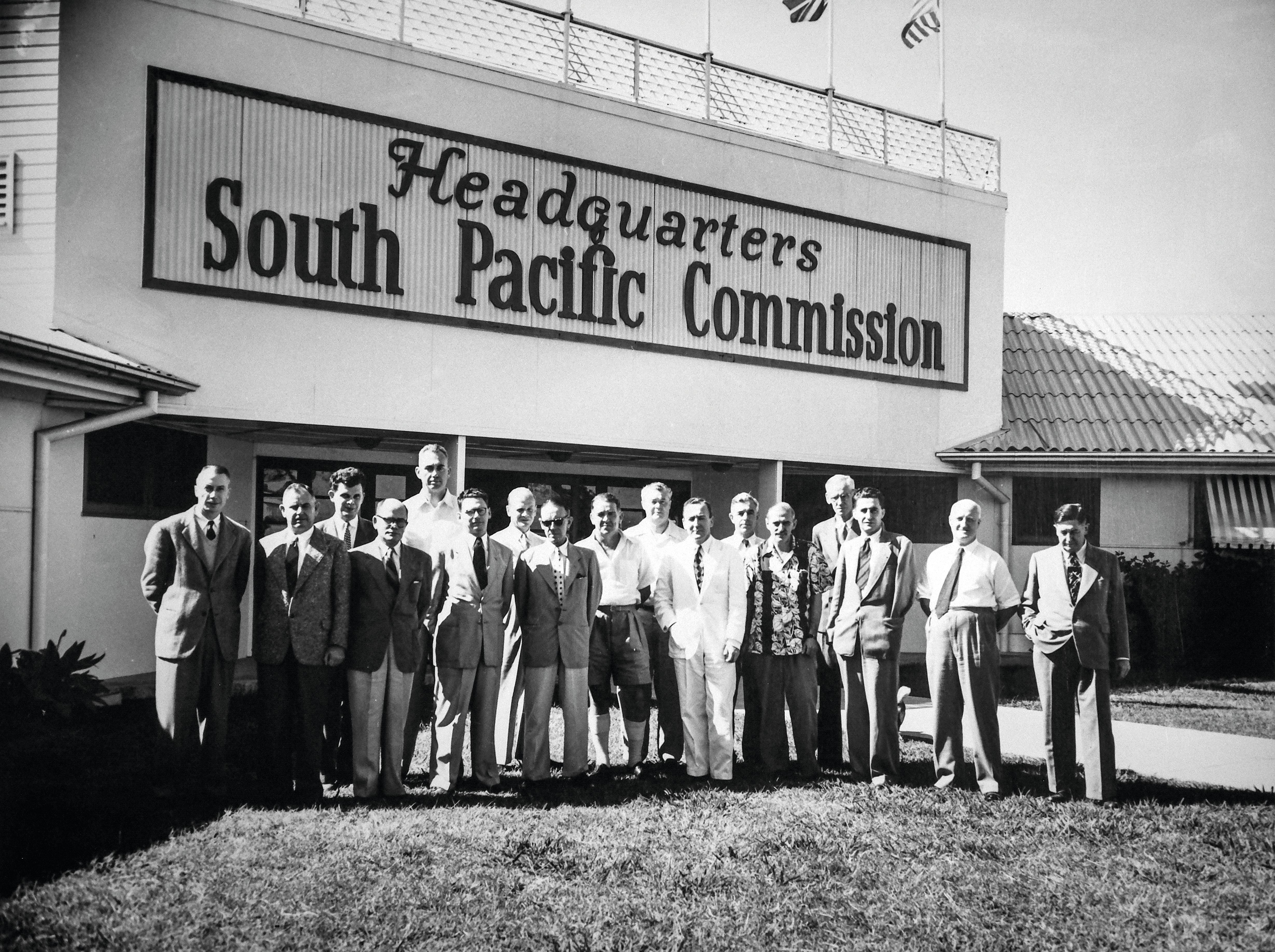 Men pose outside the South Pacific Commission headquarters in New Caledonia. Photo/SPC Not for reproduction