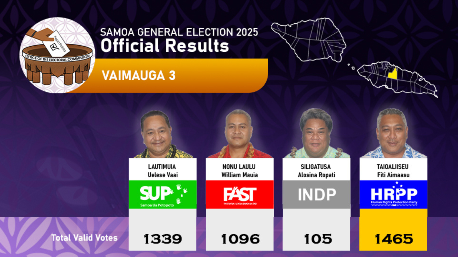 Official results of the 2025 General Elections for Vaimauga III. Photo/Sāmoa Office of the Electoral Commissioner