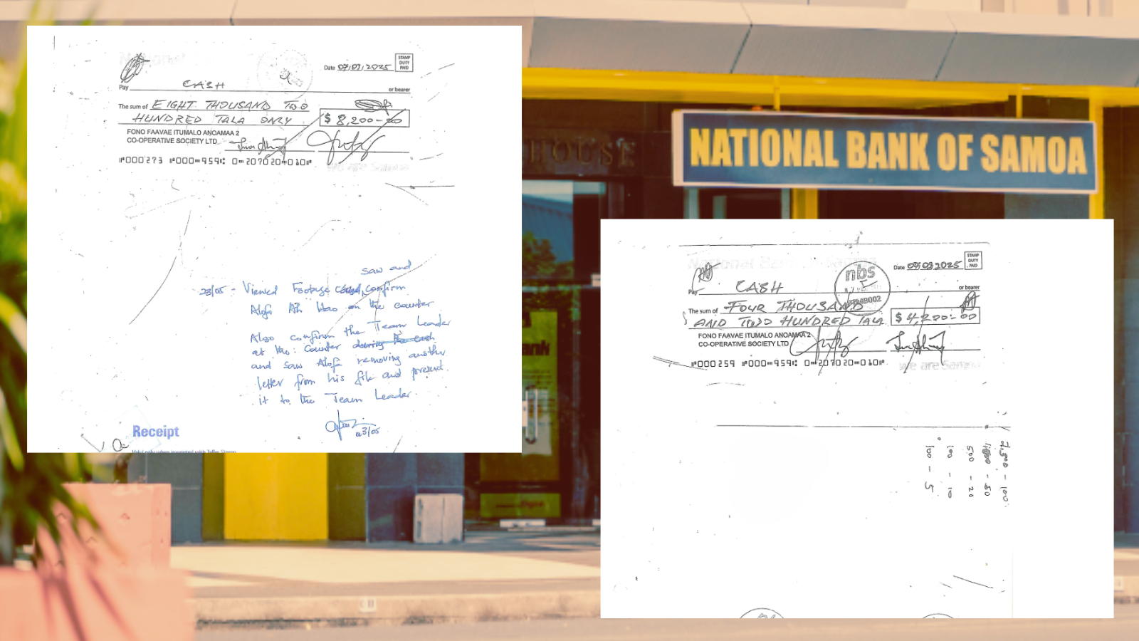 Sāmoa Observer published copies of the cheques, and report that neither document bears Lauofo's signature. Photos/Sāmoa Observer/Composite image by Renate Rivers