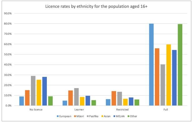Pacific communities have higher instances of no licence, and lower amounts of fully licenced drivers. Image/Motu Research 2021