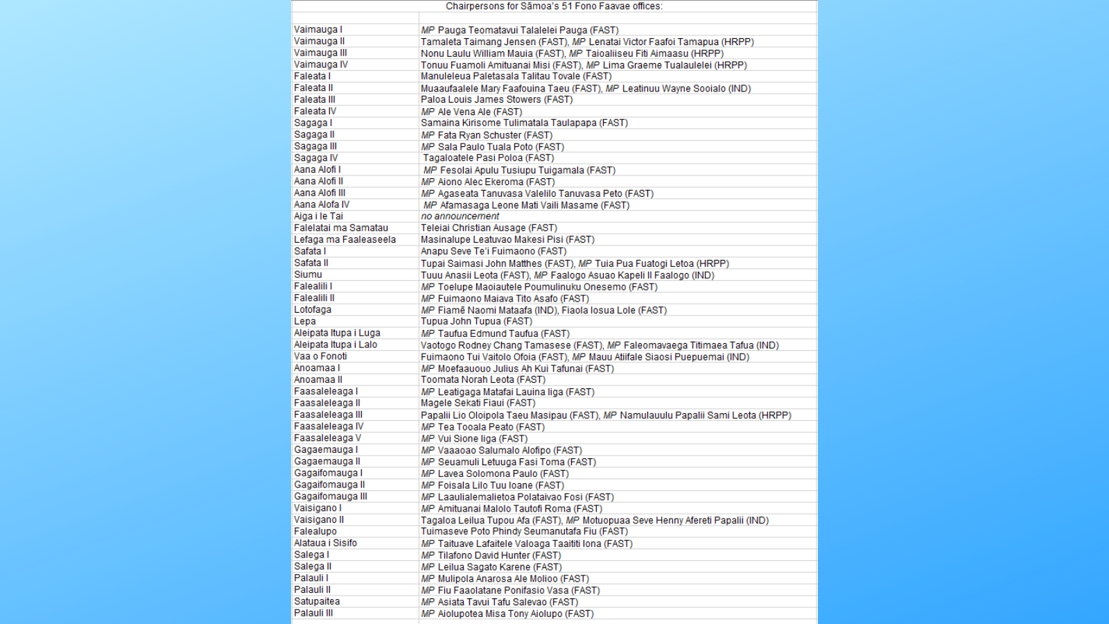 Prime Minister Laaulialemalietoa verbally read the list to the media, noting 11 of the 51 districts would have co-chairpersons - one aligned with FAST, the other an MP from the HRPP or Independent seats.