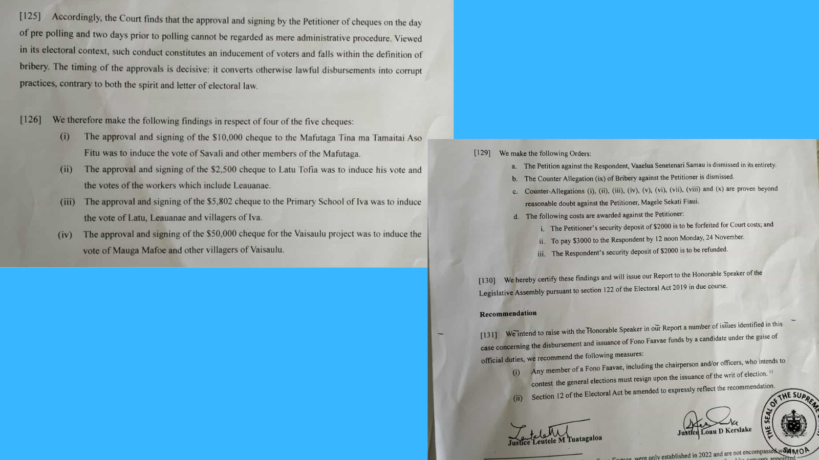 On 21 November 2025, Samoa Global News shared snippets of the Electoral Court decision for the Faasaleleaga II election petition, on their website. The snippets show that the petitioner (Magele Sekati Fiaui) was found guilty of bribery. Photo/Samoa Global News