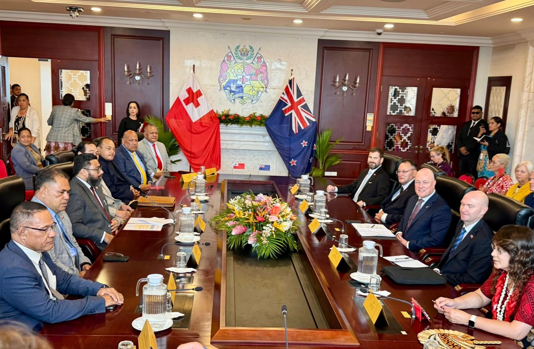 Tongan leaders and officials, seated left, with NZ Prime Minister Christopher Luxon and his delegation. Photo/NZ High Commission Tonga.
