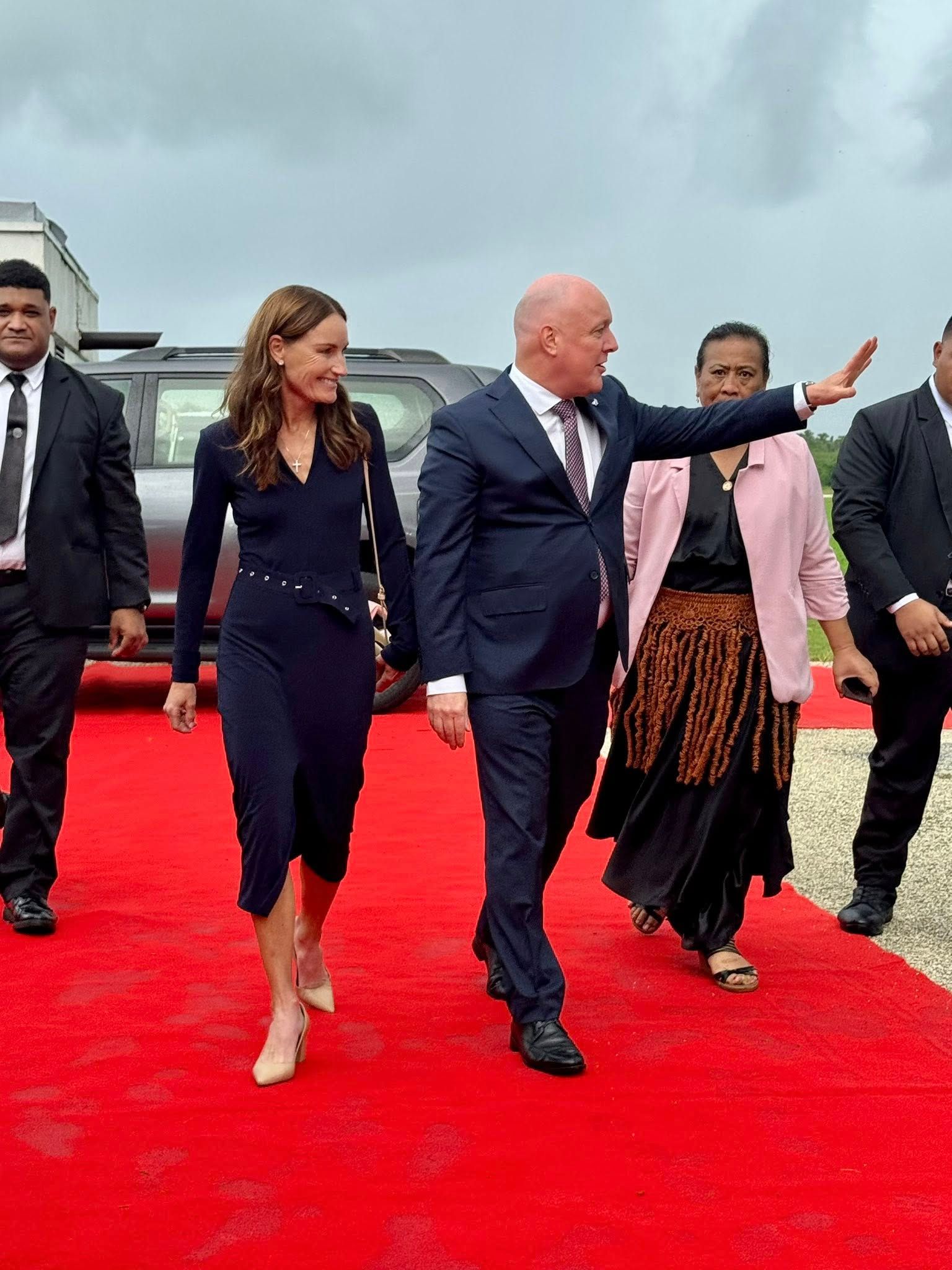 New Zealand PM Christopher Luxon, right, and wife Amanda are given a red carpet welcome in Nuku'alofa. Photo/NZ High Commission.