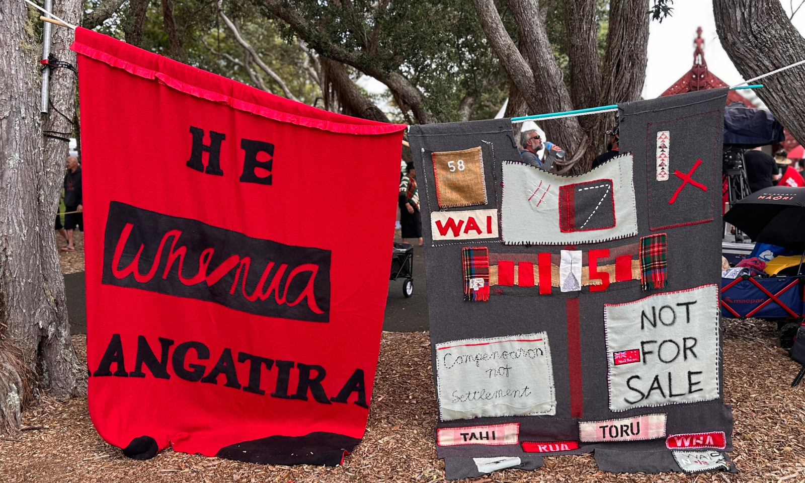 Banners were hung up by protesters around the Treaty Grounds. Photo/PMN News