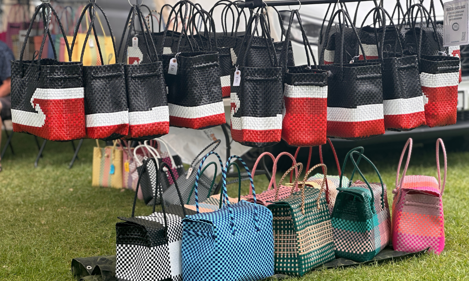 Kete (woven bags) made from recycled plastic strips for sale. Photo/PMN News