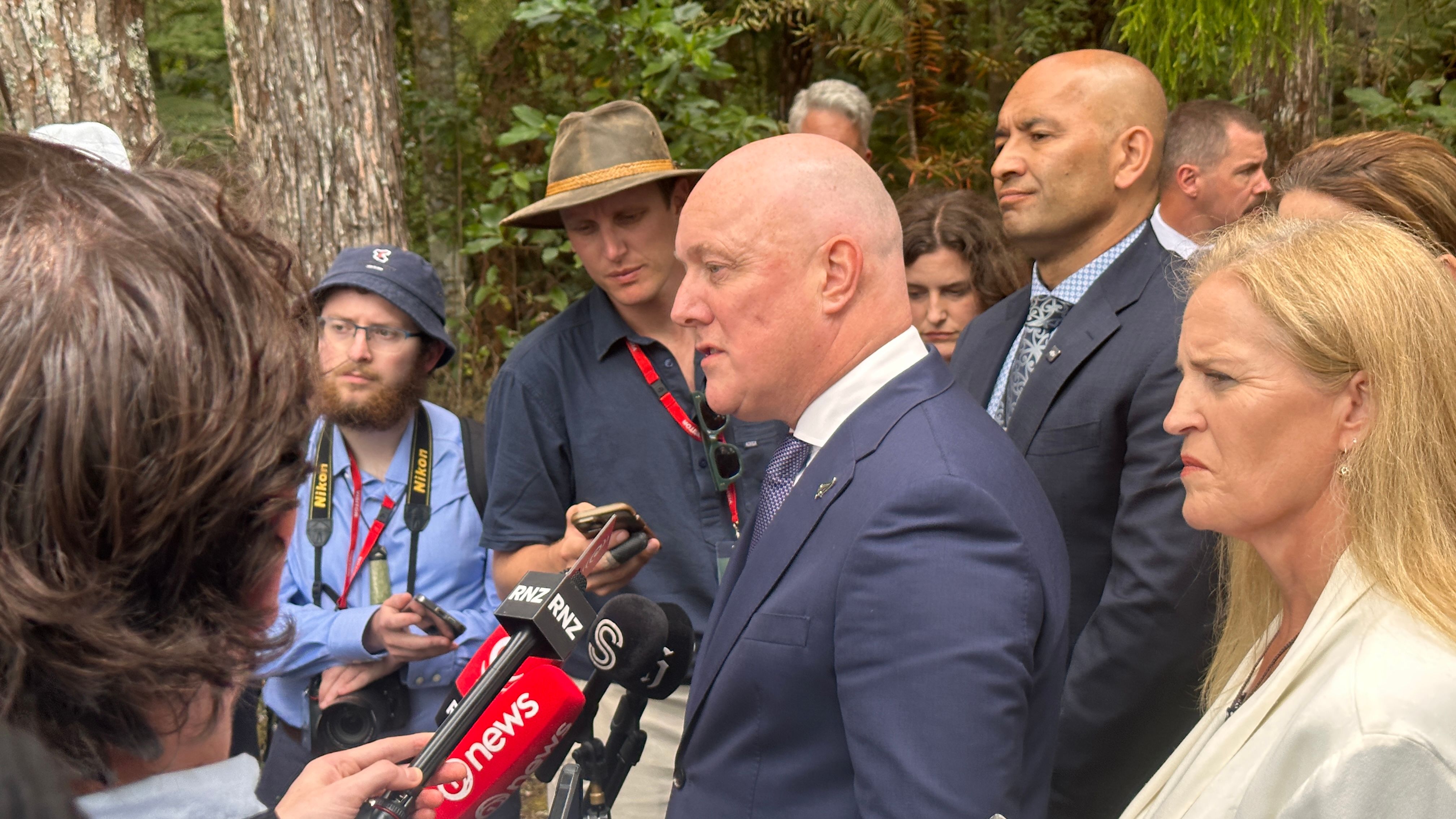 Prime Minister Christopher Luxon speaks to media following the pōhiri. Photo/PMN News