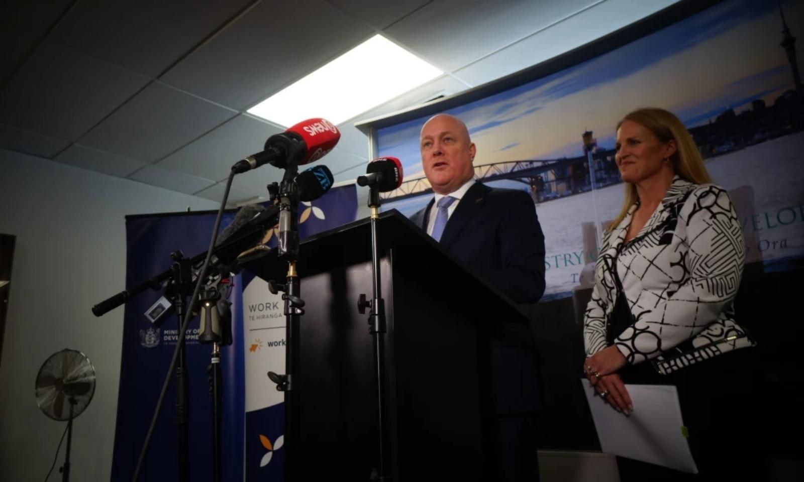 Prime Minister Christopher Luxon and Social Development Minister Louise Upston announce Jobseeker changes. Photo/RNZ/Kim Baker Wilson
