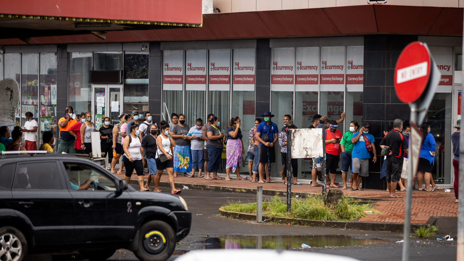 A typical scene in Sāmoa leading up to special events in the country: Long queues in Apia for money transfer services. Photo/Vaitogi A Matafeo/Sāmoa Observer
