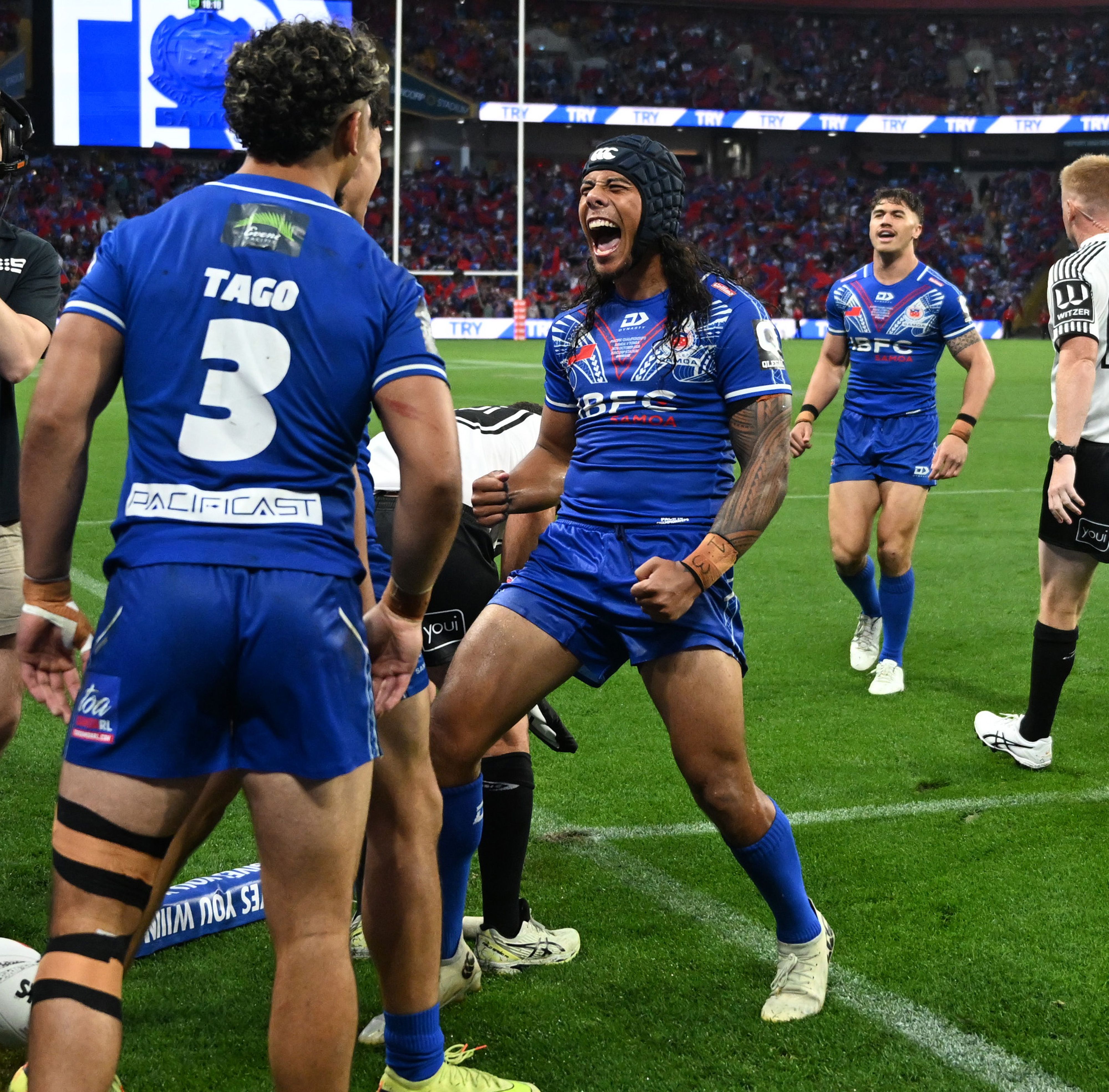 Toa Sāmoa player Jarome Luai celebrating a try. Photo/NRL