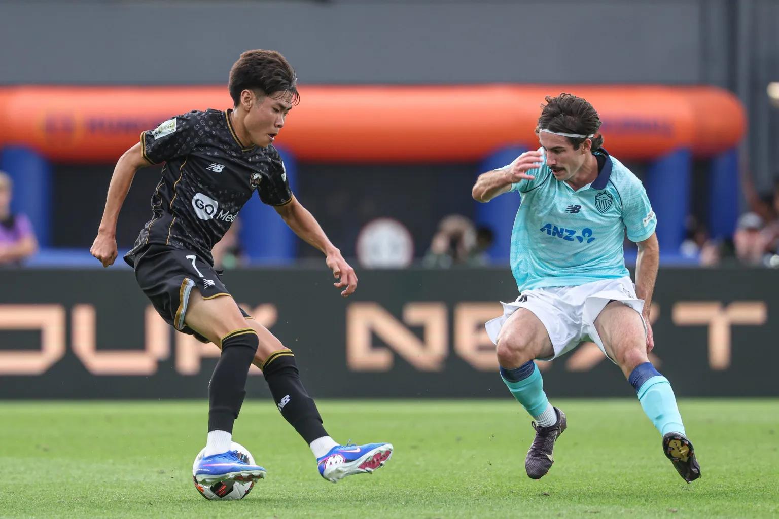 South Island United’s David Yoo, left, and Auckland FC’s Liam Gillion during their opening OFC Pro League match in Auckland. Photo/OFC Media/Phototek/Shane Wenzlick