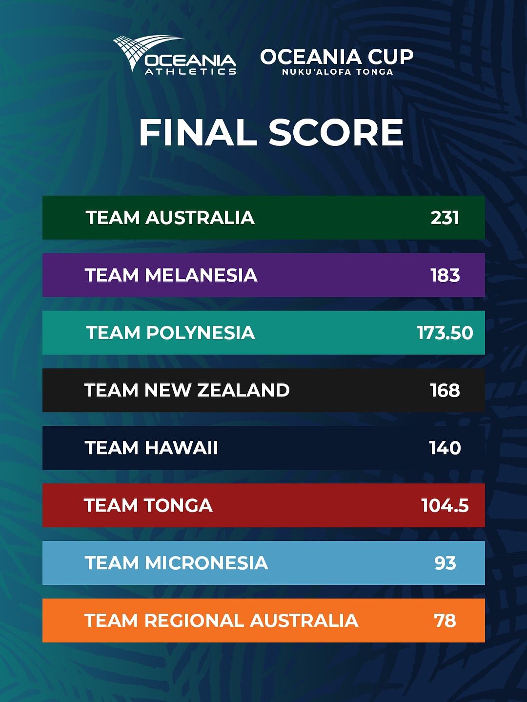 Australia topped the team standings with 231 points, followed by Melanesia (183), and Polynesia (173.5).