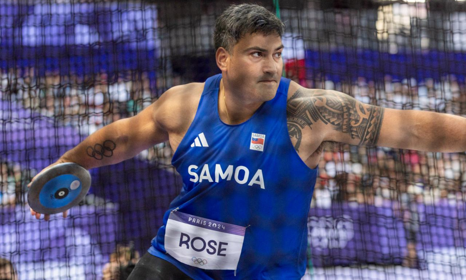 Alex Rose during his Olympic discus attempt last year, making history by reaching the final and placing 12th with a 61.89 m throw. Photo/Samoa Association of Sports and National Olympic Committee