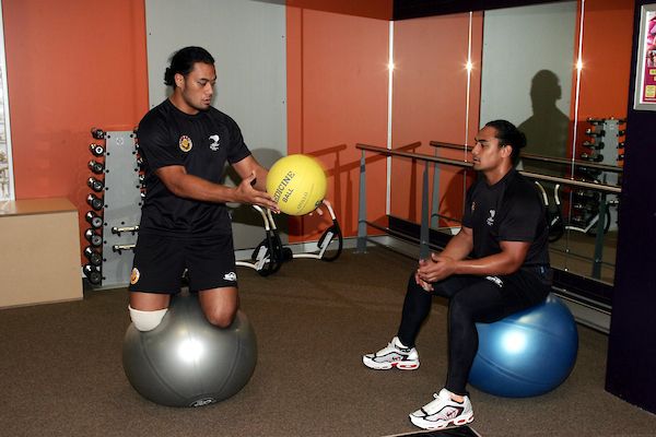 Tony Puletua, left, and Joe Galuvao at a NZ Kiwis training session in Gosford, NSW, in 2004. Galuvao’s work with the RLPA focuses on identity, wellbeing, and life beyond rugby league. Photo/Photosport/Andrew Cornaga
