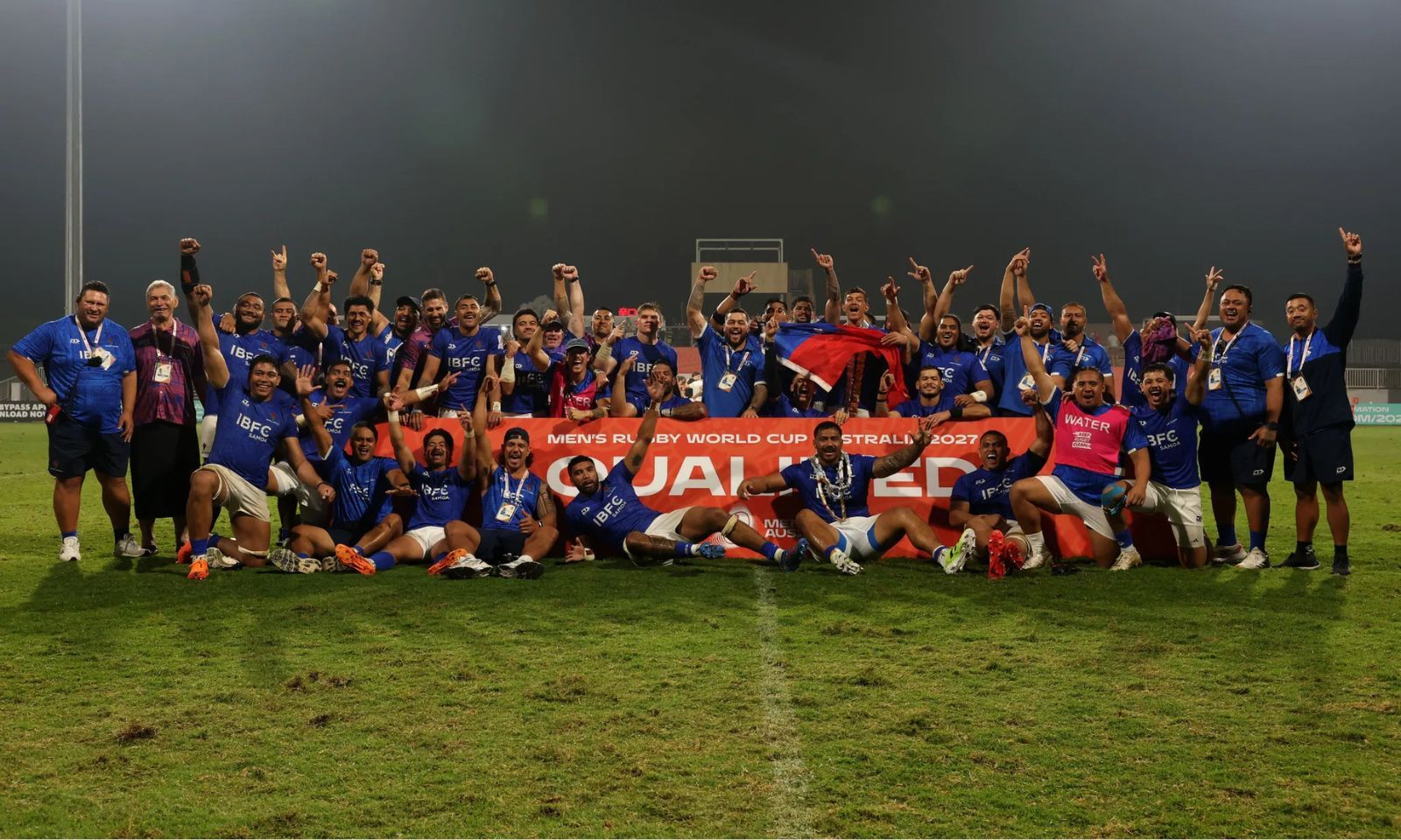 Manu Sāmoa players and team officials celebrate in Dubai after securing their place at the 2027 Rugby World Cup. Photo/Facebook/Manu Sāmoa