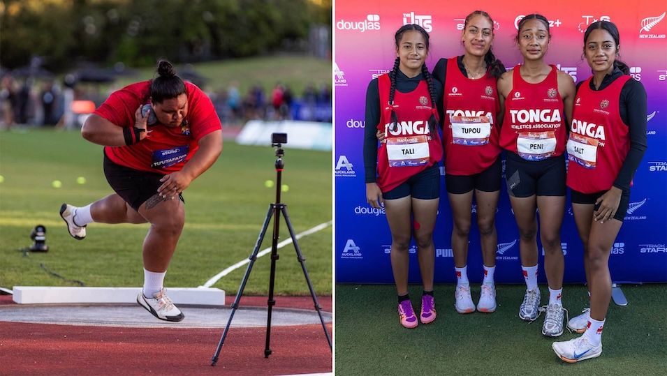 Tonga’s ʻAtamaama Tuʻutafaiva (left) celebrates gold in the women’s shot put, while (right) the Tonga women’s 4x400m relay team of Ane Tali, Angelina Tupou, Langakali Peni and Alilia Salt compete in Auckland. Composite photo/Oceania Athletics.