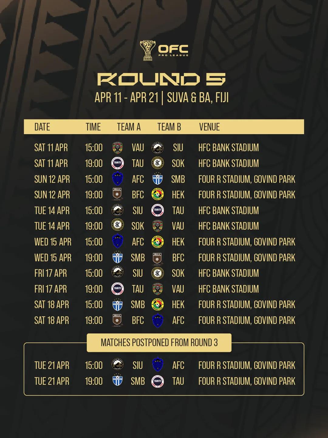 Four games remain in round five and will be played on Friday and Saturday in Fiji. For details, click here.