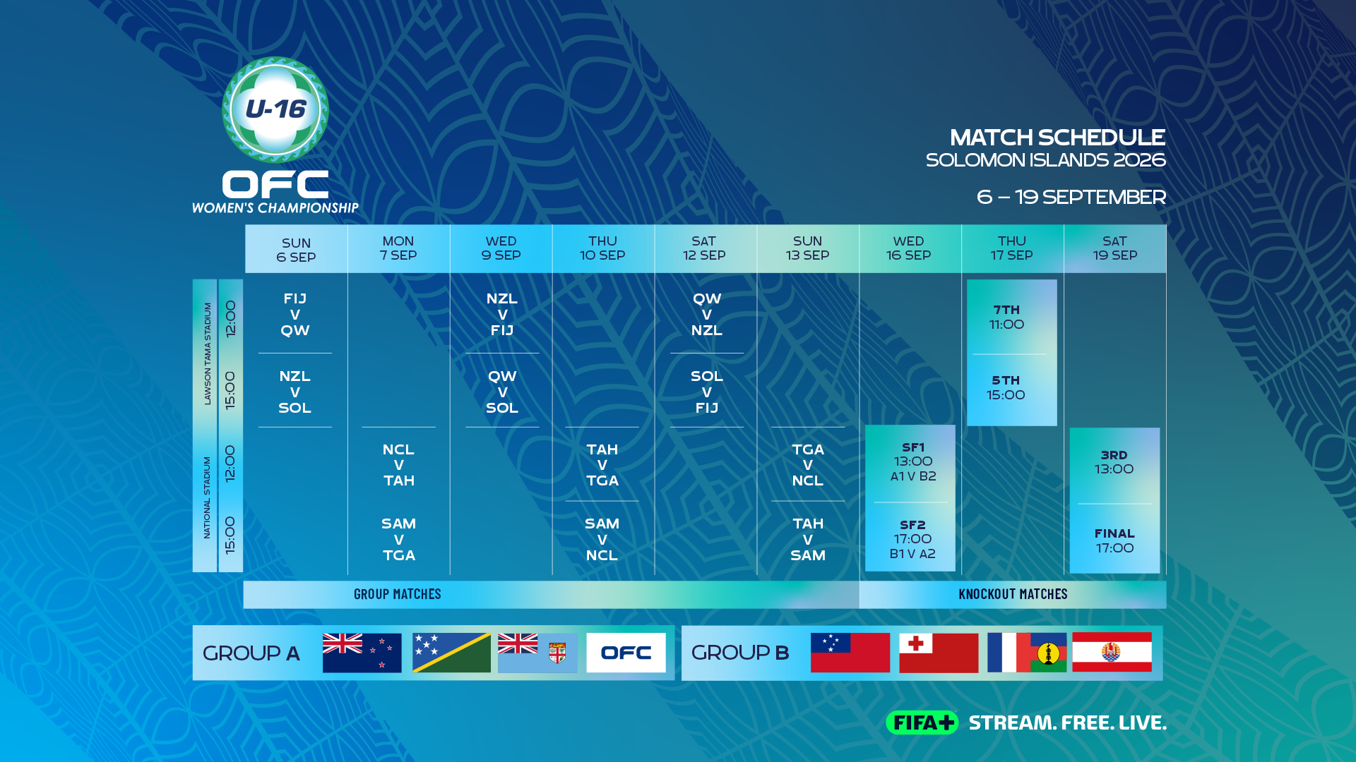Group B sees 2025 finalists Sāmoa up against Tonga, New Caledonia, and Tahiti in what promises to be an open battle for the semi-final spots.