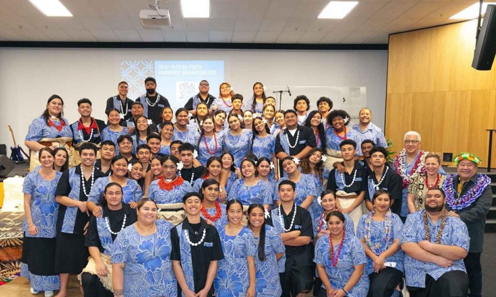Tula’i graduates and staff, including programme co-founder Siaosi Gavet (right). The West Auckland initiative supports Pacific high school students to strengthen identity and prepare for future study or work. Photo/University of Auckland