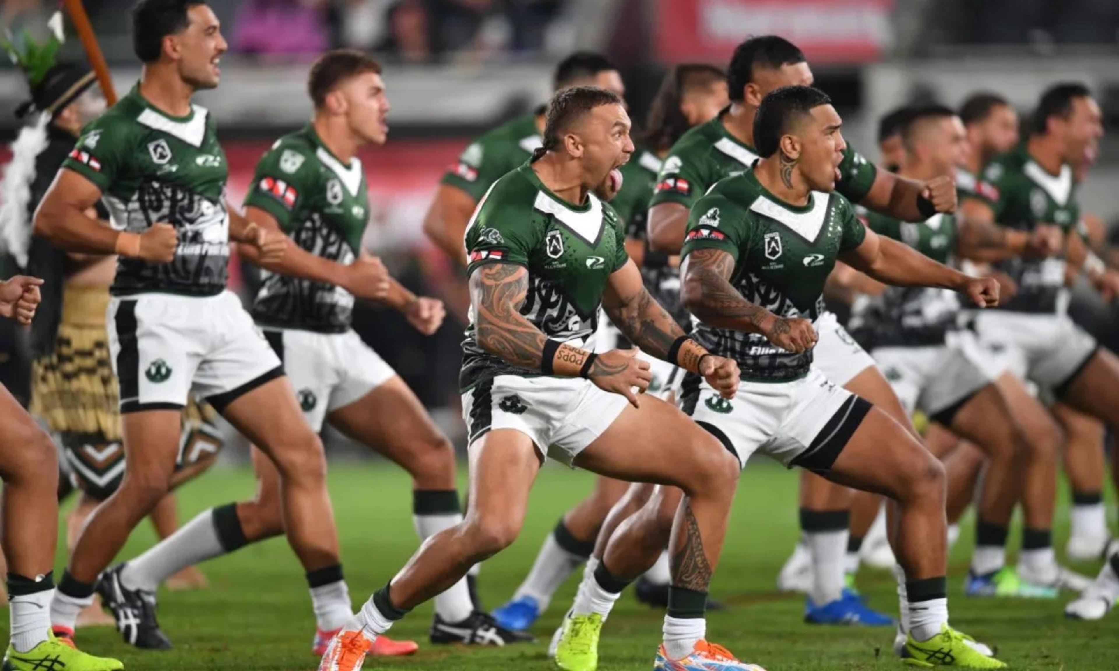 Indigenous All Stars players perform a powerful pre-match haka-style challenge, centring culture and identity ahead of their clash with the New Zealand Māori side.