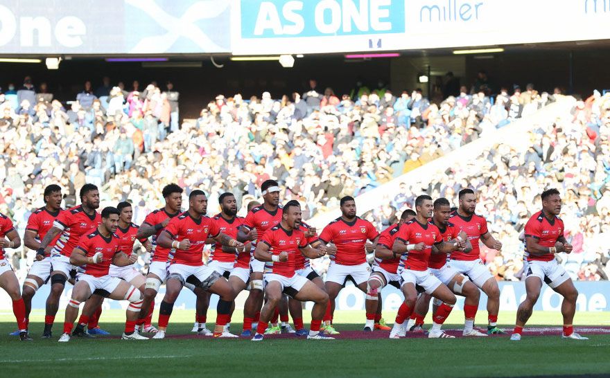 The Tongans perform their traditional Sipi Tau ahead of the game at Scottish Gas Murrayfield in 2021. Scotland won 60-14. Photo/scottishrugby.org