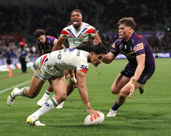 Dallin Watene-Zelezniak crosses for one of his two tries as the Warriors dominate in Melbourne. Photo/Photosport/NRL Photos
